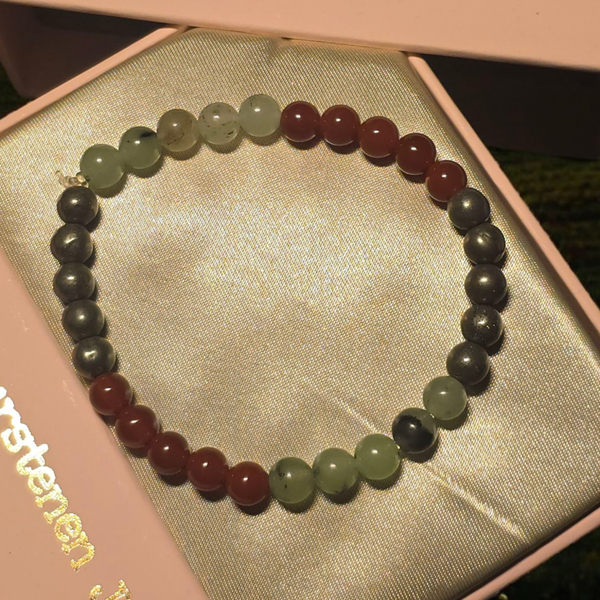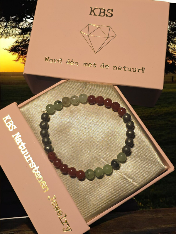 De combinatie van carneool, peridoot en pyriet is krachtig; peridoot ondersteunt emotioneel en mentaal herstel, carneool stimuleert passie en creativiteit, en pyriet biedt fysieke vitaliteit en bescherming, waardoor deze combinatie bijdraagt aan zelfvertrouwen, welvaart en een gezonde balans.